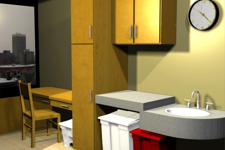 Hospital equipment was meticulously recreated for these interior views of Mercy Medical Center private rooms. Strategically placed lighting was added to create the interesting shadows.